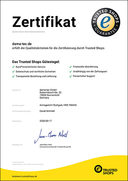 Wir freuen uns, dass wir kürzlich mit dem Trusted Shops Gütesiegel ausgezeichnet wurden. Diese Zertifizierung bestätigt unseren Anspruch, unseren Kunden nicht nur hochwertige Produkte, sondern auch ein rundum sicheres und verlässliches Einkaufserlebnis zu bieten.